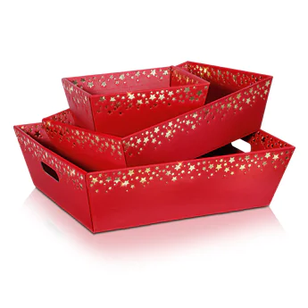 Präsentkorb "Sternregen Rot" aus Karton, offene Welle Rot mit Metalliceffektlackierung. Der Geschenkkarton ist mit goldenen Folienprägung auf vier versehen.